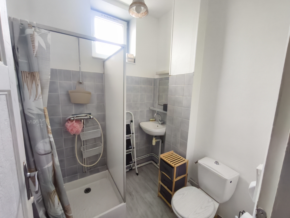 Vous découvrirez une entrée desservant la cuisine équipée (four, plaque, hote, réfrigérateur, lave-linge) et le salon/salle à manger lumineux. Vous trouverez ensuite une grande chambre et un couloir avec placard au mur menant à la salle d’eau avec WC.